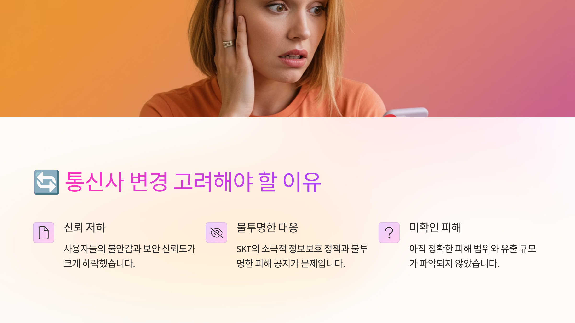 SKT 해킹 사건을 계기로 통신사 변경을 고민하는 사람들이 정말 많아졌어요. 그만큼 이유가 충분하다는 뜻이겠죠?🔍